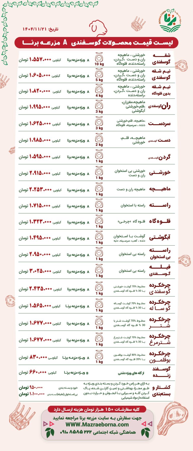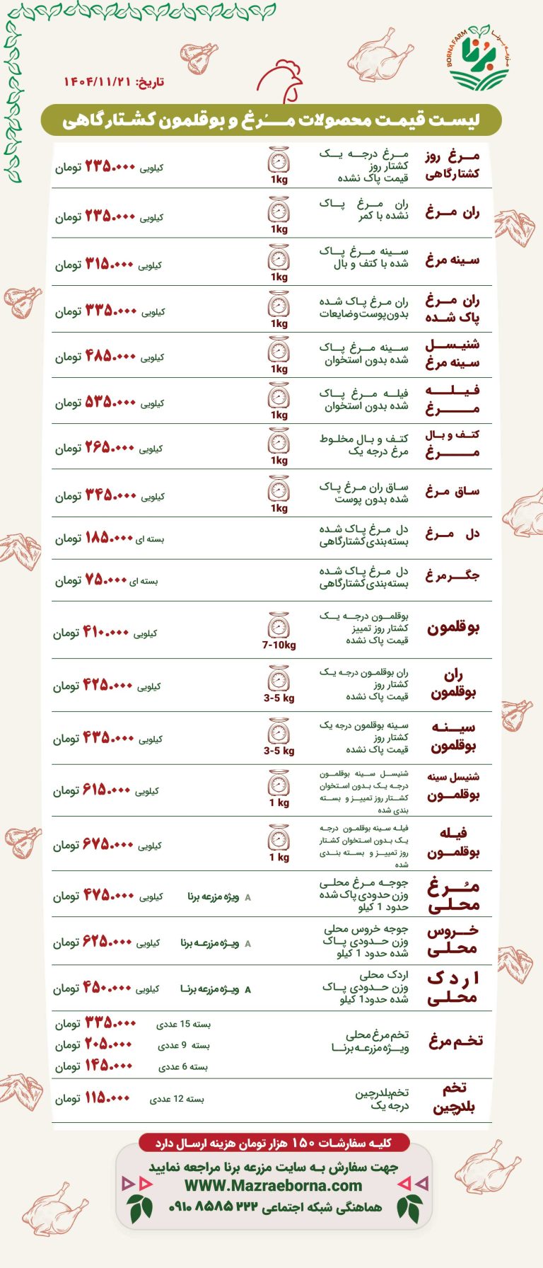 لیست قیمت محصولات مرغ و بوقلمون کشتارگاهی
