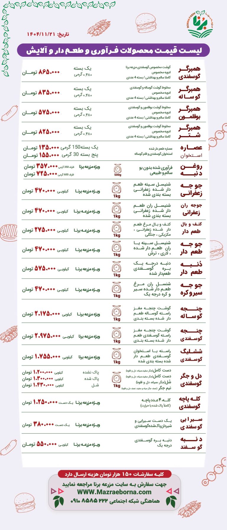 لیست قیمت محصولات فرآوری و طعم دار و آلایش