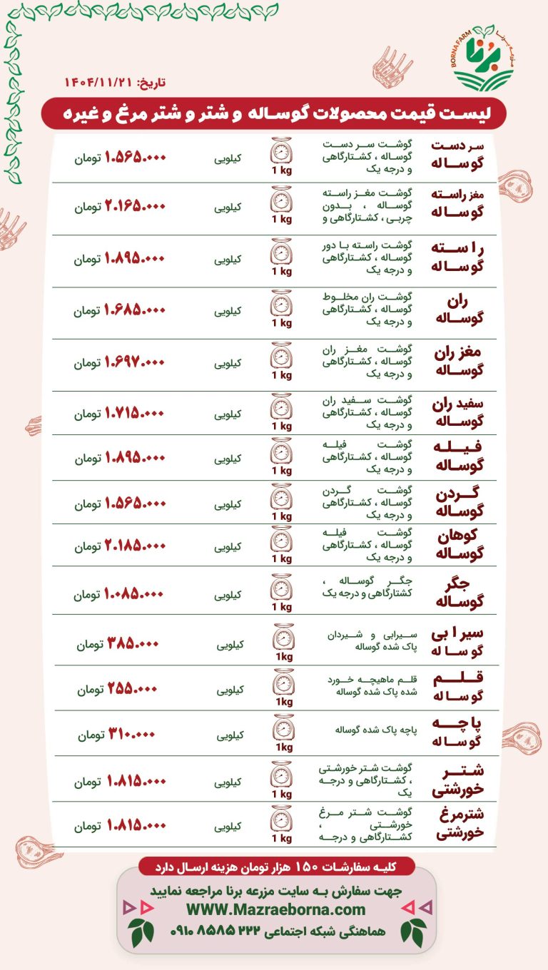 لیست قیمت محصولات گوساله شتر و شترمرغ